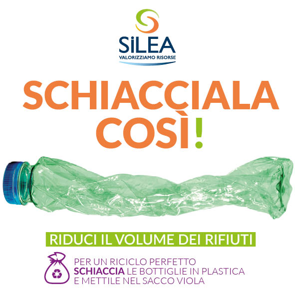 Campagna volta ad incentivare i cittadini a ridurre il volume dei rifiuti, come? Schiacciando le bottiglie di plastica in orizzontale prima di metterle nel sacco viola.